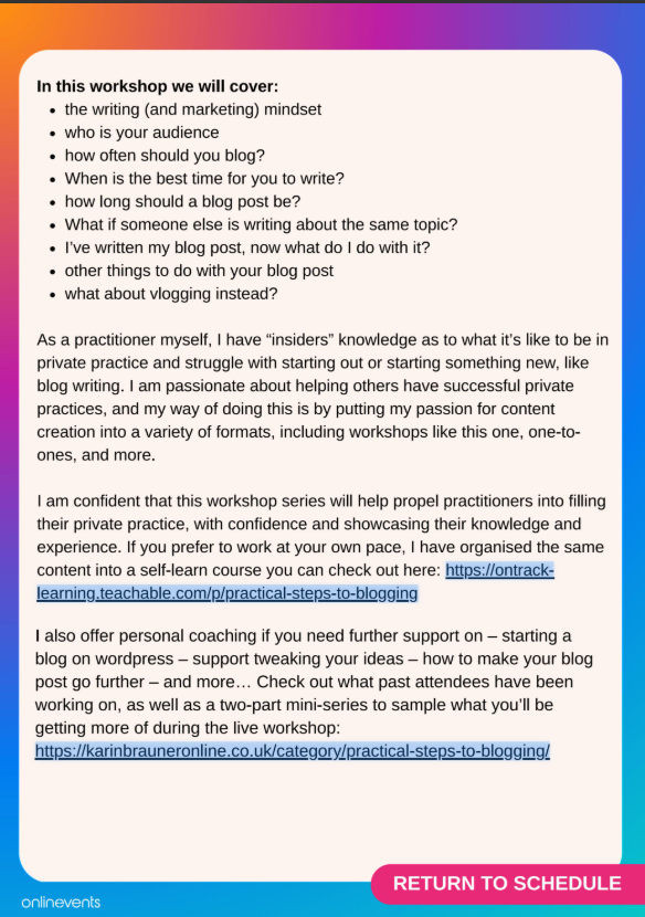 (Note: I run Practical Steps to blogging, as a workshop, self-learn course and private coaching, which is not recorded)